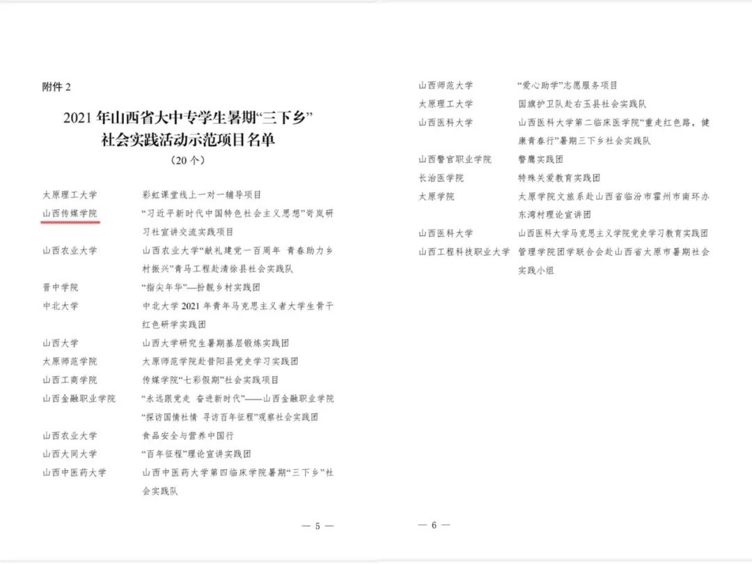 近日,共青团山西省委发布了《关于公布2021年山西省大中专学生暑期文化科技卫生“三下乡”社会实践活动评选结果的通知》。在本次活动中,我校“习近平新时代中国特色社会主义思想”“岢岚研习社宣讲交流实践项目”被评为示范项目;“建党100周年山西省展览馆解说员实践队”被评为优秀团队;李诺、罗迪、张琪婧被评为服务标兵。 “三下乡”是指“文化、科技、卫生”下乡,各高校利用暑期开展的一项旨在提高大学生综合素质,在实...