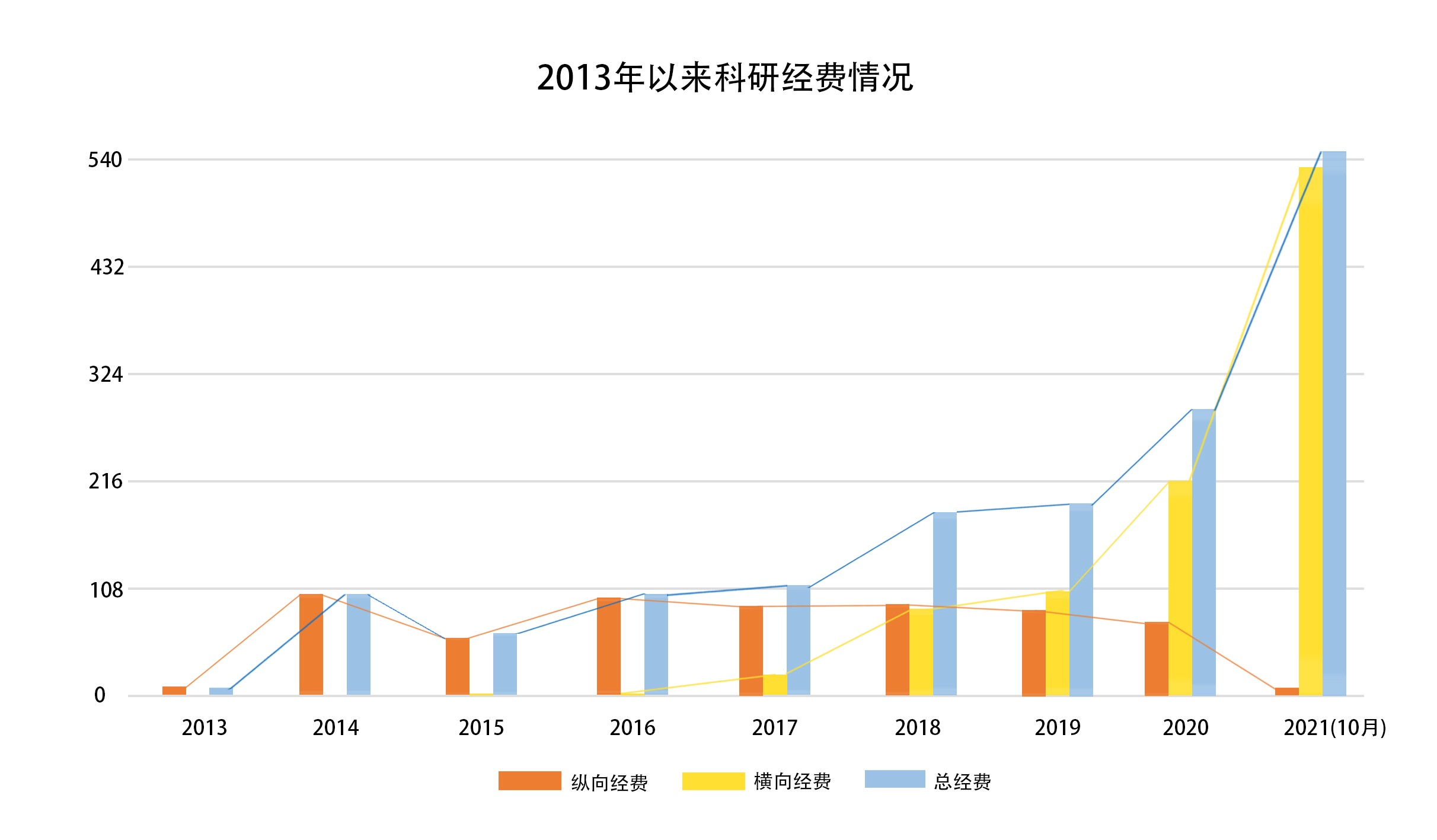 2013年以来,我校科研项目年度经费迅速增长,已由2013年的26.2万元,增长到2022年的1727.5万元,增幅近65倍;其中纵向项目经费增长6倍多,横向项目经费增长300多倍