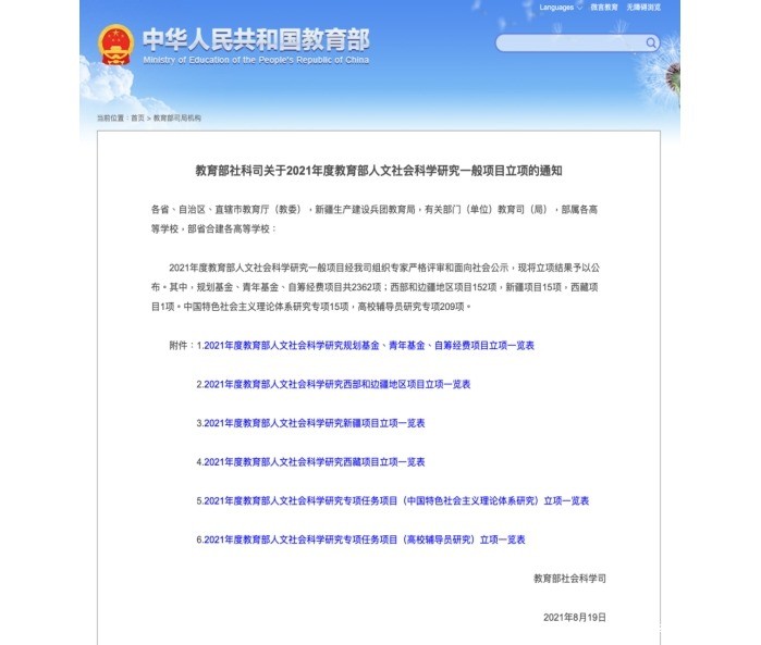 8月19日,教育部社会科学司正式公布了2021年度教育部人文社会科学研究一般项目立项结果。我校教师刘嘉申报的“国家声音与文化政治:人民广播80年话筒声音研究”获得青年基金项目资助。教育部人文社科研究项目是国内人文社科领域的高层次研究项目,也是衡量一所高校人文社科水平的重要指标之一,该类项目注重加强基础研究,强化应用研究,鼓励对策研究,支持传统学科、新兴学科和交叉学科,重视成果转化。今年,教育部人文社科立...